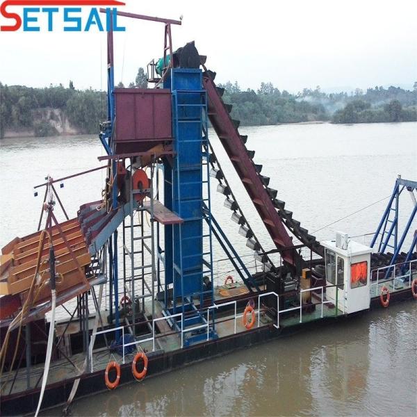 | Setsail bucket chain dredgers are designed for different soil conditions especial large rocks. With big dredging depth and low cost. this type of dredger is mostly suitable for projects like rivers lakes sand dredging. The dredger can complete the integrated procedures of sand excavation washing and separating so as fine sand will be got. Dredging work is done by the continuous running of buckets amounted on the bucket ladder. chain bucket dredger can combine with the mining machinery for river gold and diamond so on. |